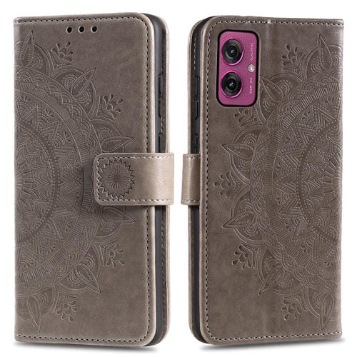 Funda de Cuero con Relieve de Flores para Motorola Moto G55 con Cordón (Gris)