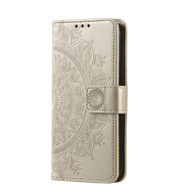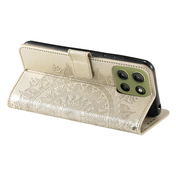 Funda de Cuero con Relieve de Flores y Tótem para Motorola Moto G15 con Cordón (Dorado)