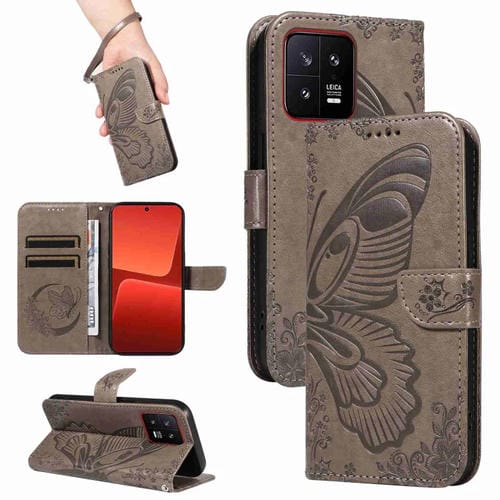 Funda de Cuero con Relieve de Mariposa para Xiaomi 13 (Gris)