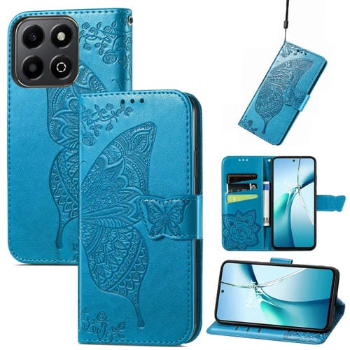 Funda de Cuero con Relieve Mariposa y Flor para Honor 200 (Azul)