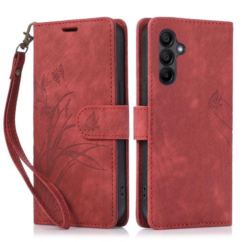 Funda de Cuero Samsung Galaxy A16 5G con Relieve Mariposa y Orquídea (Roja)