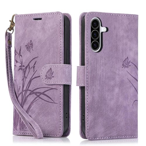 Funda de Cuero Samsung Galaxy A36 5G con Relieve de Mariposa y Orquídea (Morado)