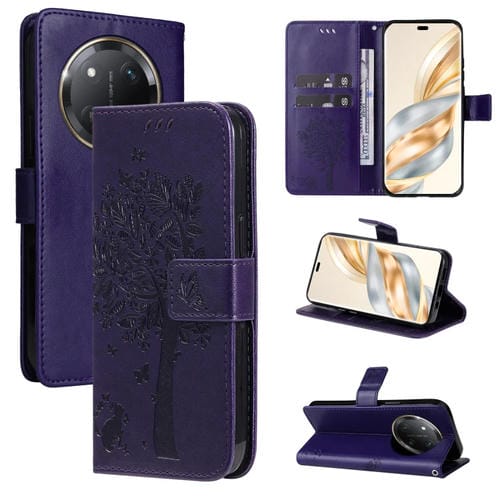 Funda de Cuero con Tapa para Honor X9C 5G Global con Estampado de Árbol y Gato (Morado)
