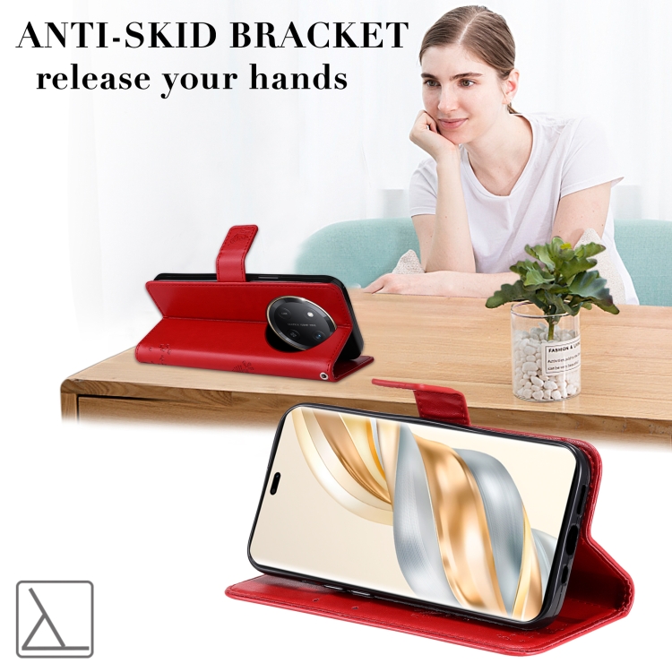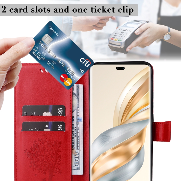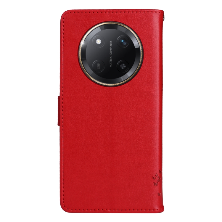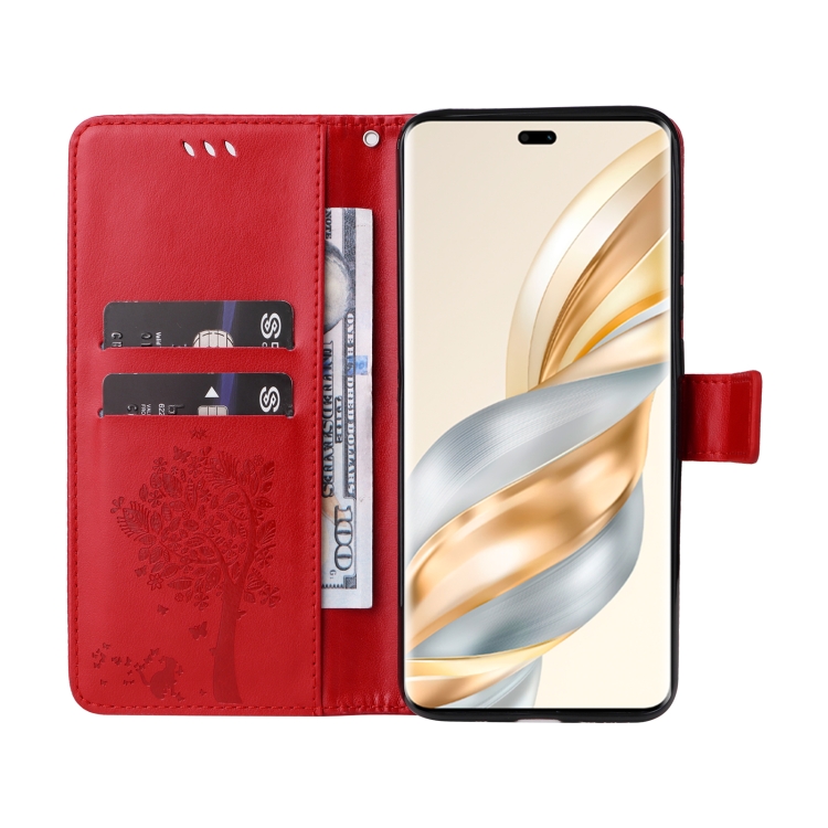 Funda de Cuero con Tapa para Honor X9C 5G Global con Estampado de Árbol y Gato (Roja)