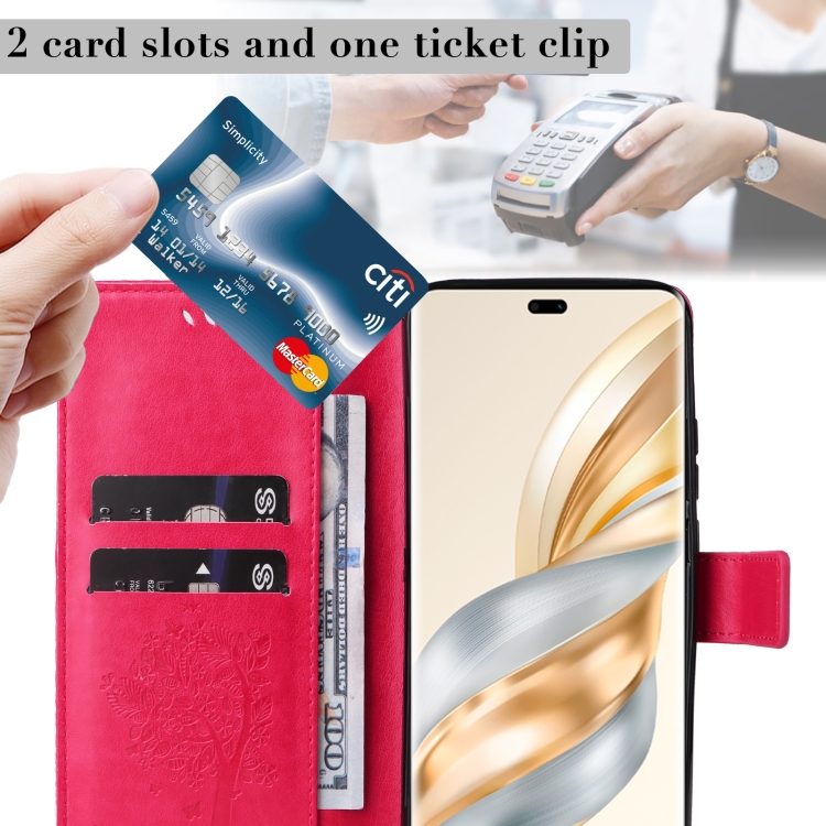 Funda de Cuero con Tapa para Honor X9C 5G Global con Estampado de Árbol y Gato (Rosa Rojo)