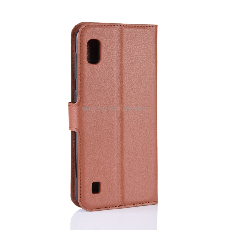 Funda de cuero con tapa horizontal con textura Litchi para Galaxy A10, con billetera, soporte y ranuras para tarjetas (marrón)
