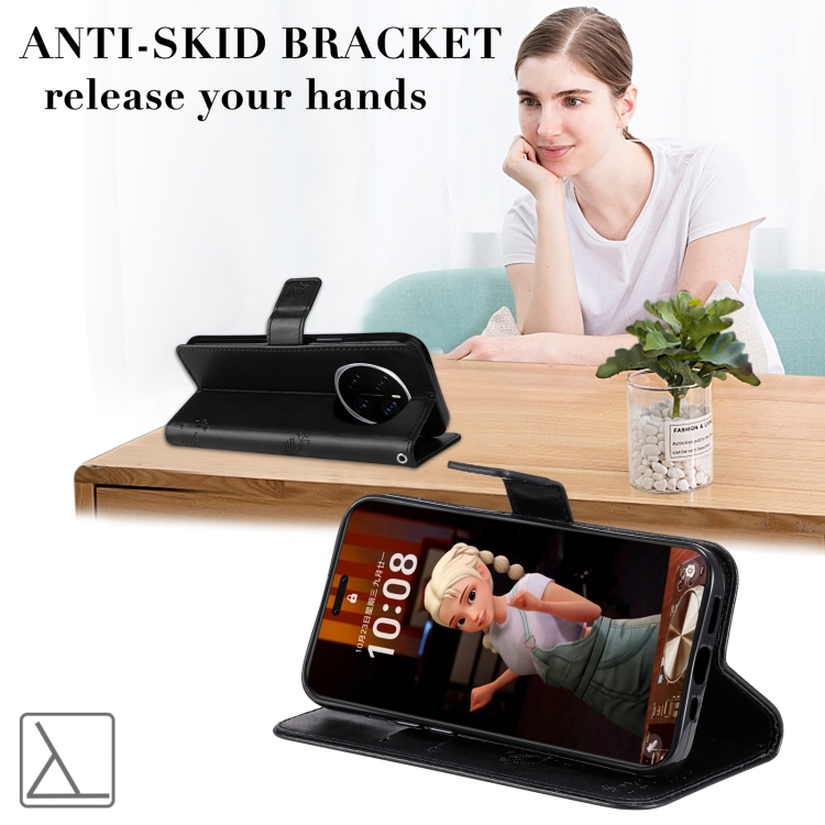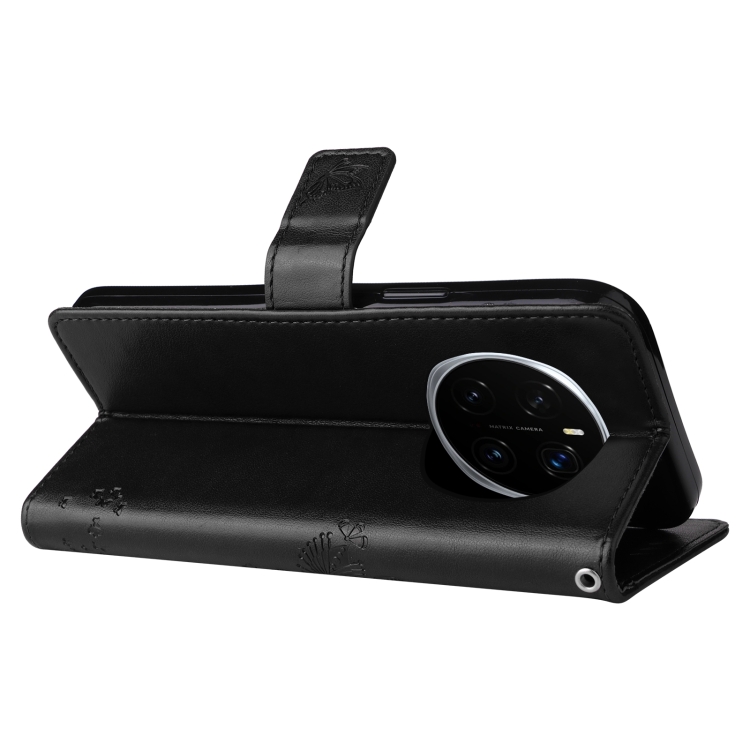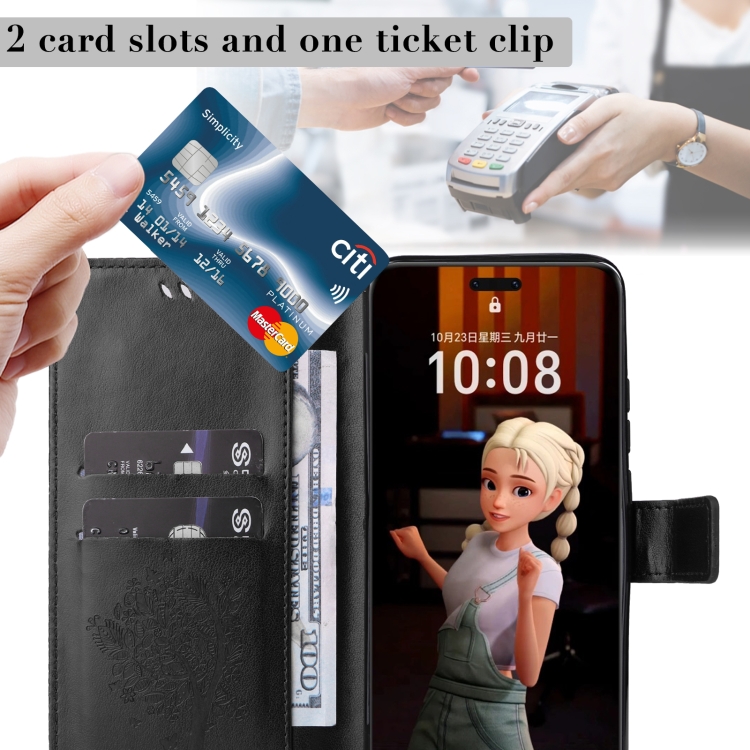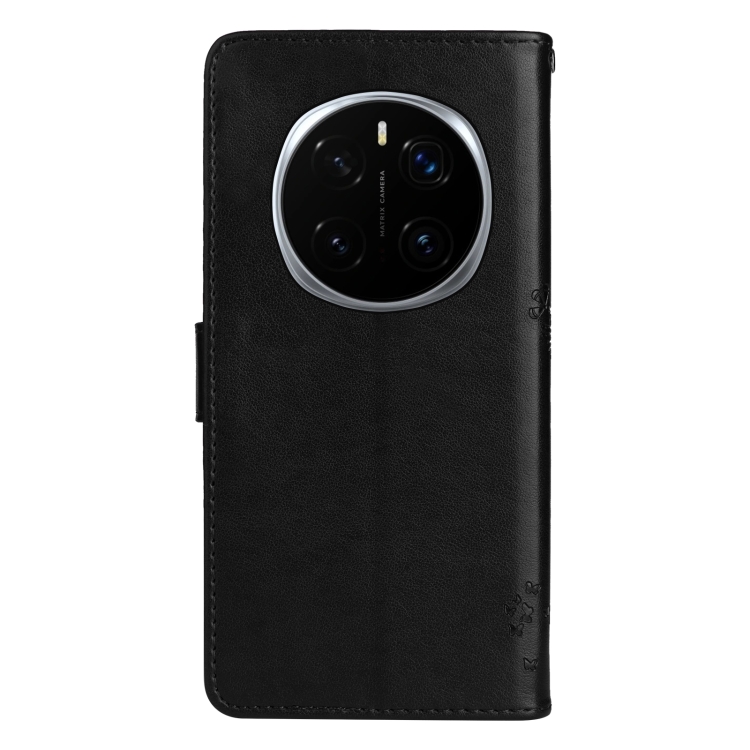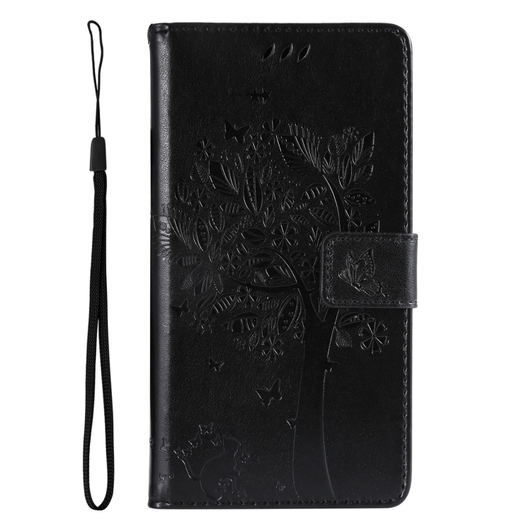 Funda de Cuero con Tapa para Honor Magic7 Pro Diseño Árbol y Gato En Relieve (Negra)