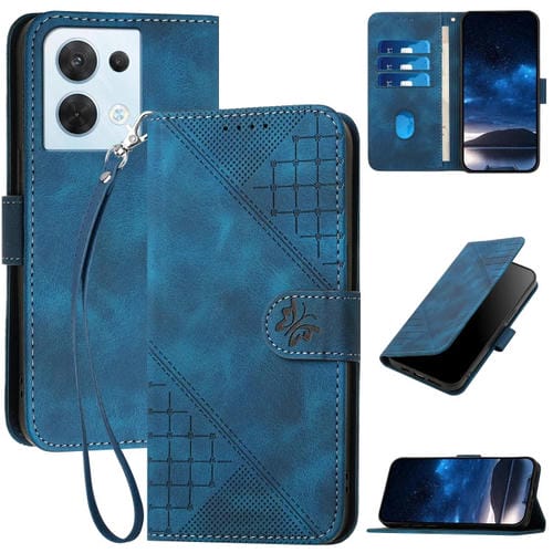 Funda de Cuero con Tapa y Cordón para Oppo Reno8 5G Global Yx0080 con Diseño En Relieve de Mariposa y Cuadrícula (Azul Oscuro)