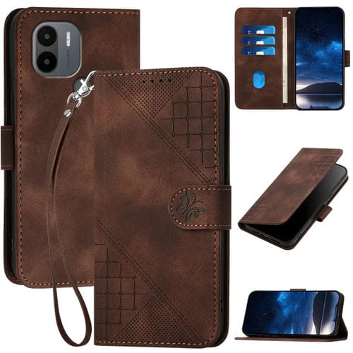 Funda de Cuero con Tapa y Cordón para Redmi A1+ Yx0080 con Diseño En Relieve de Mariposas y Cuadrícula (Café)