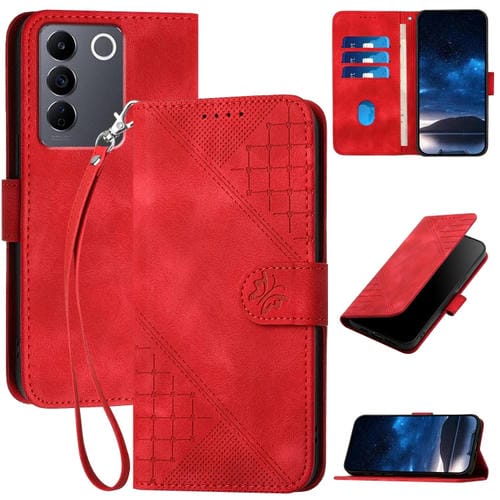 Funda de Cuero con Tapa y Cordón para Vivo V27 5G Global Yx0080 con Diseño En Relieve de Mariposa y Cuadrícula (Rojo)