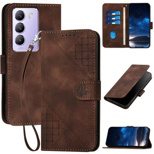 Funda de Cuero con Tapa y Cordón para Vivo Y100 5G Idn Yx0080 con Diseño En Relieve de Mariposa y Cuadrícula (Café)