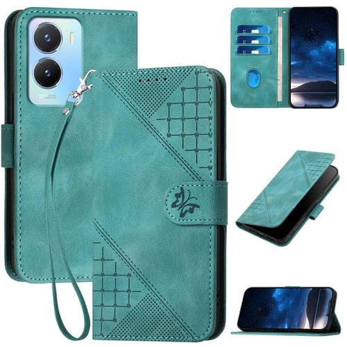 Funda de Cuero con Tapa y Cordón para Vivo Y16 4G Global Yx0080 con Diseño En Relieve de Mariposa y Cuadrícula (Azul Claro)