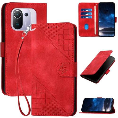 Funda de Cuero con Tapa y Cordón para Xiaomi Mi 11 Pro Yx0080 con Diseño En Relieve de Mariposa y Cuadrícula (Rojo)