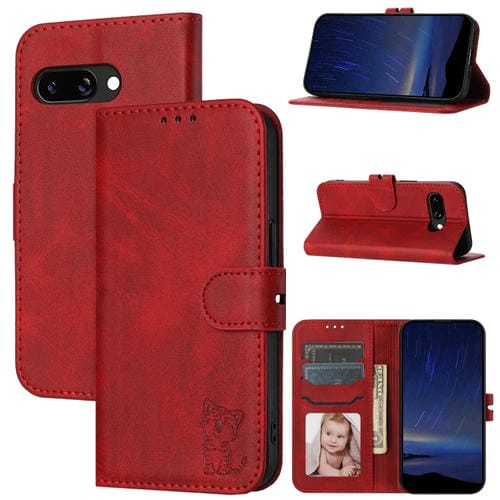 Funda de Cuero con Tapa Google Pixel 9A Diseño Gato Feliz en Relieve (Rojo)