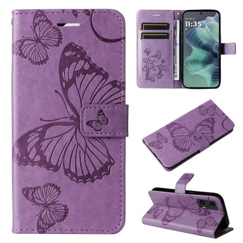 Funda de Cuero con Tapa y Mariposa en Relieve 3D para Motorola Moto G35 (Morado)
