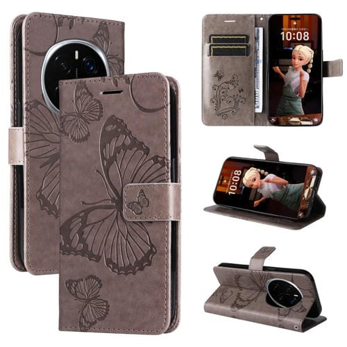 Funda de Cuero con Tapa para Honor Magic7 Pro Diseño Mariposas en Relieve 3D (Gris)