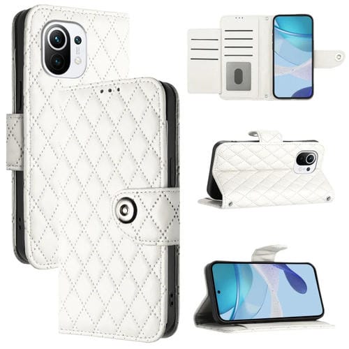 Funda de Cuero con Tapa y Textura Rómbica para Xiaomi Mi 11 con Cordón (Blanco)