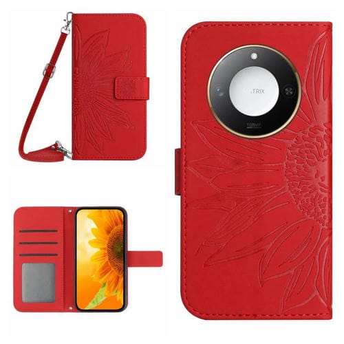 Funda de Cuero para Honor X9C con Diseño de Flores y Sol y Cordón (Rojo)