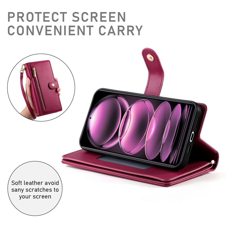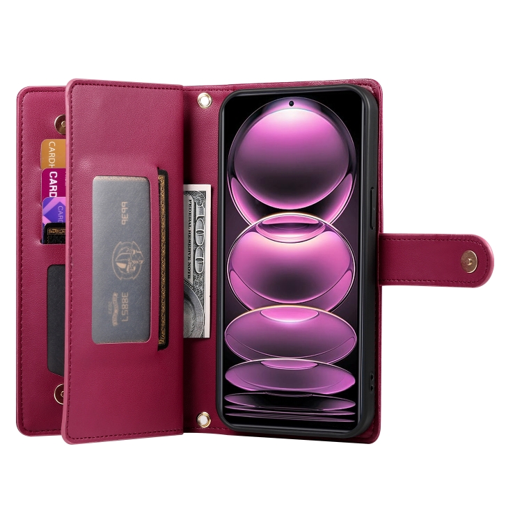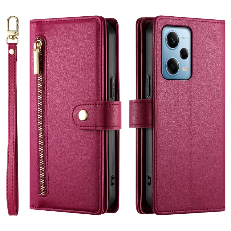 Funda de Cuero para Teléfono con Nueve Ranuras para Tarjetas y Cremallera para Redmi Note 12 Pro / Xiaomi Poco X5 Pro (Rojo)