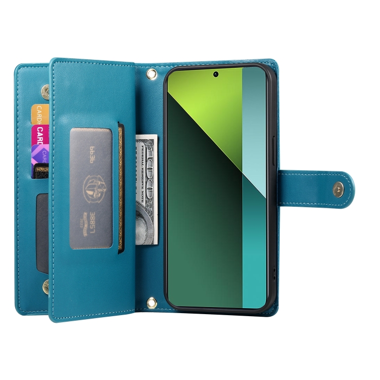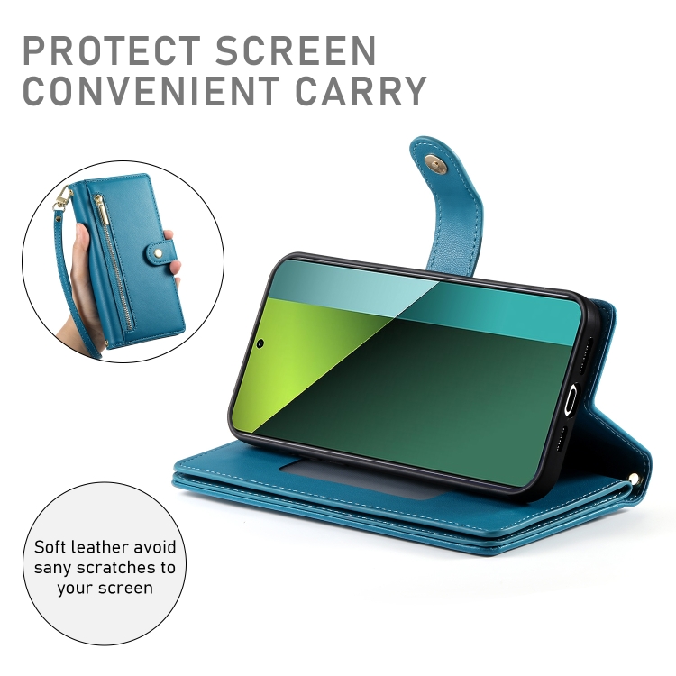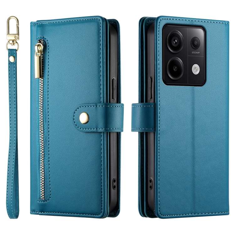 Funda de Cuero para Teléfono con Nueve Ranuras para Tarjetas y Cremallera para Redmi Note 13 Pro 5G/Xiaomi Poco X6 (Azul)