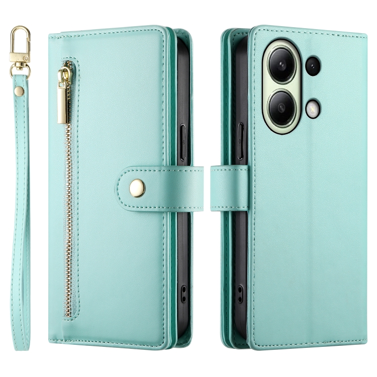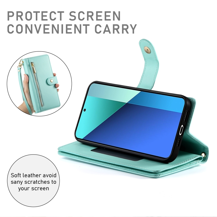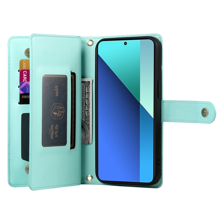 Funda de Cuero para Teléfono Redmi Note 13 4G con Nueve Ranuras para Tarjetas y Cremallera (Verde Menta)
