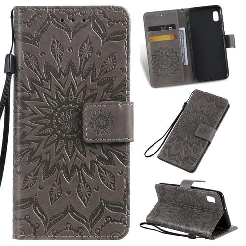 Funda Cuero Pu Galaxy A10E con Tapa Horizontal Estampado Girasol Soporte Ranuras Tarjetas Billetera Cordón (Gris)