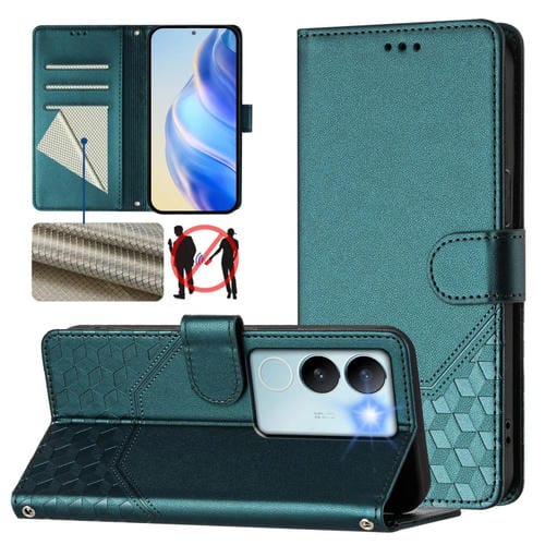 Funda de Cuero Rfid con Relieve de Panal Global para Vivo V29 5G/V29 Pro (Verde Pavo Real)