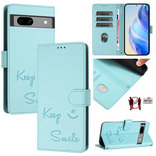 Funda de Cuero Rfid con Relieve Sonriente para Google Pixel 7A (Verde Menta)