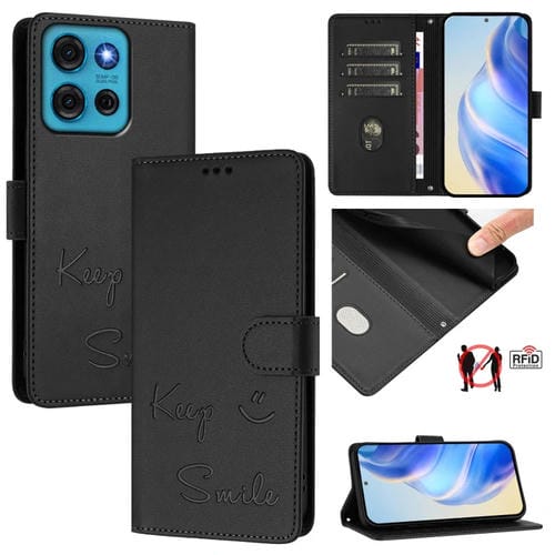 Funda de Cuero Rfid para Motorola Moto G75 5G con Relieve Sonriente (Negra)