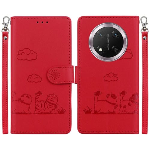 Funda de Cuero Rfid para Honor X9C con Diseño de Gatos (Roja)