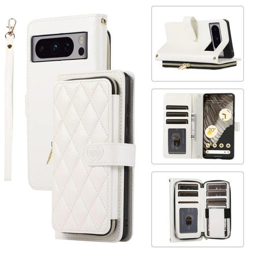 Funda de Cuero Tipo Billetera con Cremallera Completa y Diseño Rombal para Google Pixel 8 Pro (Blanca)