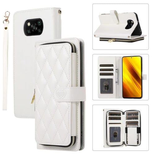 Funda de Cuero Tipo Billetera con Cremallera Completa y Diseño Rombal para Xiaomi Poco X3 Nfc (Blanca)