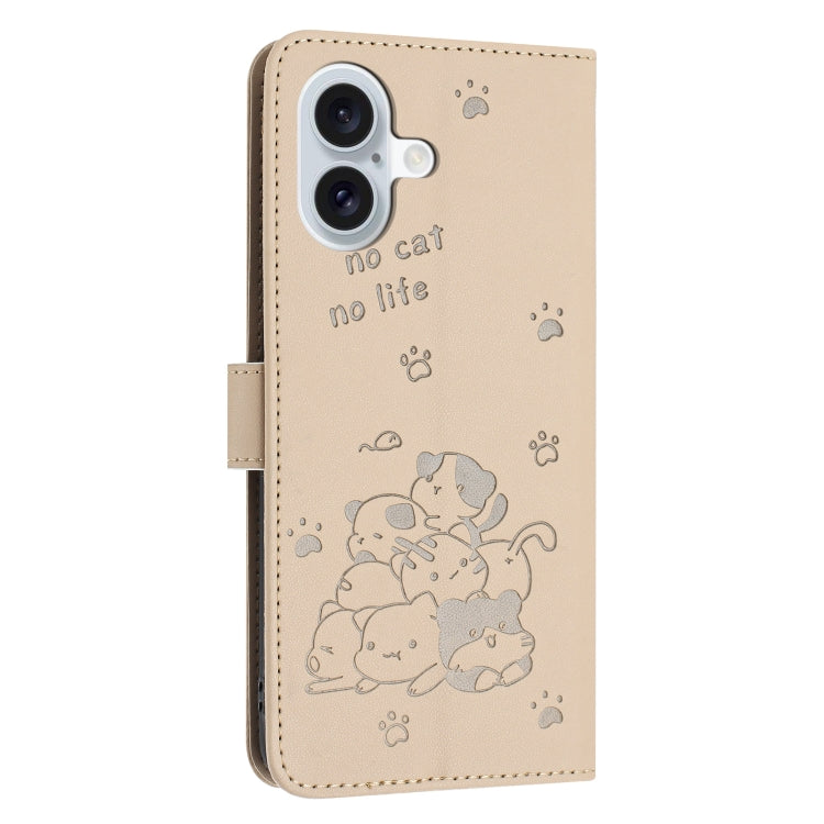 Funda de Piel para iPhone 16 con Diseño de Gatito En Relieve y Cordón (Beige)