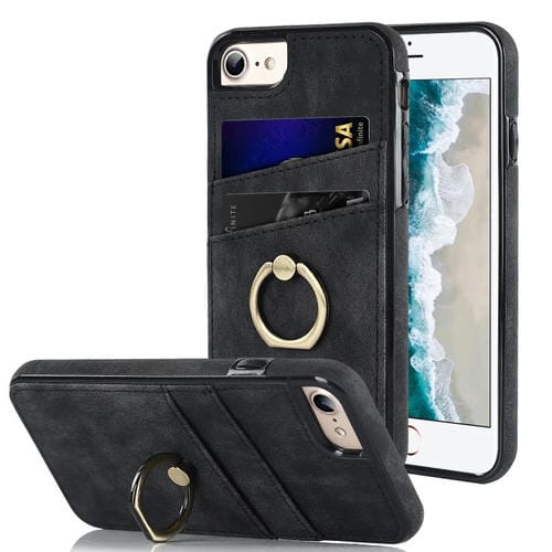 Funda de Teléfono de Cuero con Parche Vintage con Soporte para Anillo para iPhone Se 2022 / Se 2020 / 8 / 7 (Negro)