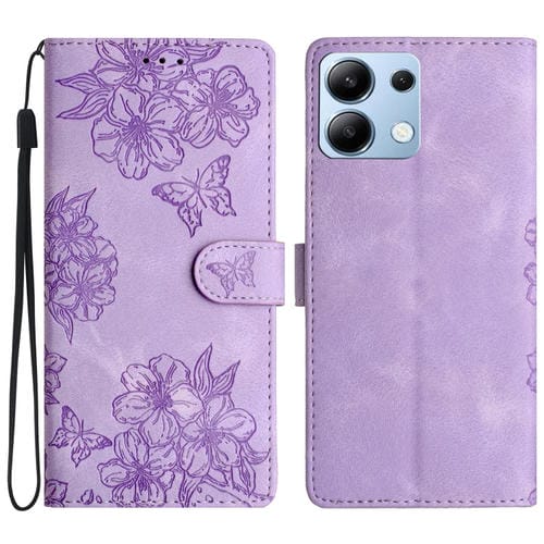 Funda de Teléfono de Pu con Relieve de Piel de Mariposa y Diseño de Flor de Cerezo para Redmi Note 13 4G (Morado)