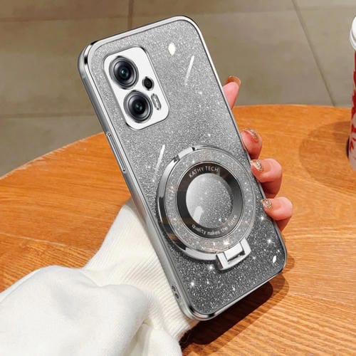 Funda de Teléfono de TPU con Soporte Redondo y Purpurina Degradada Plateada para Redmi Note 11T Pro (Plateada)