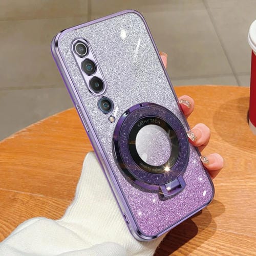 Funda de Teléfono de TPU con Soporte Redondo y Purpurina Degradada Plateada para Xiaomi Mi 10 (Morado)