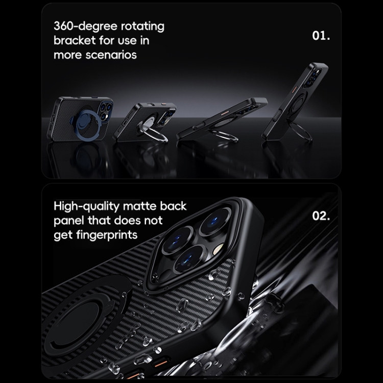Funda de Teléfono Magsafe Fibra de Carbono para iPhone 16 Pro Max con Soporte Giratorio 360 (Negro)