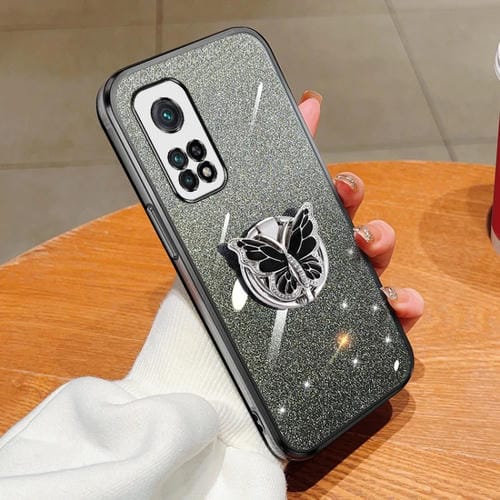 Funda de TPU con Soporte para Teléfono con Diseño de Mariposa y Purpurina Degradada para Redmi K30S/K30S Ultra (Negra)