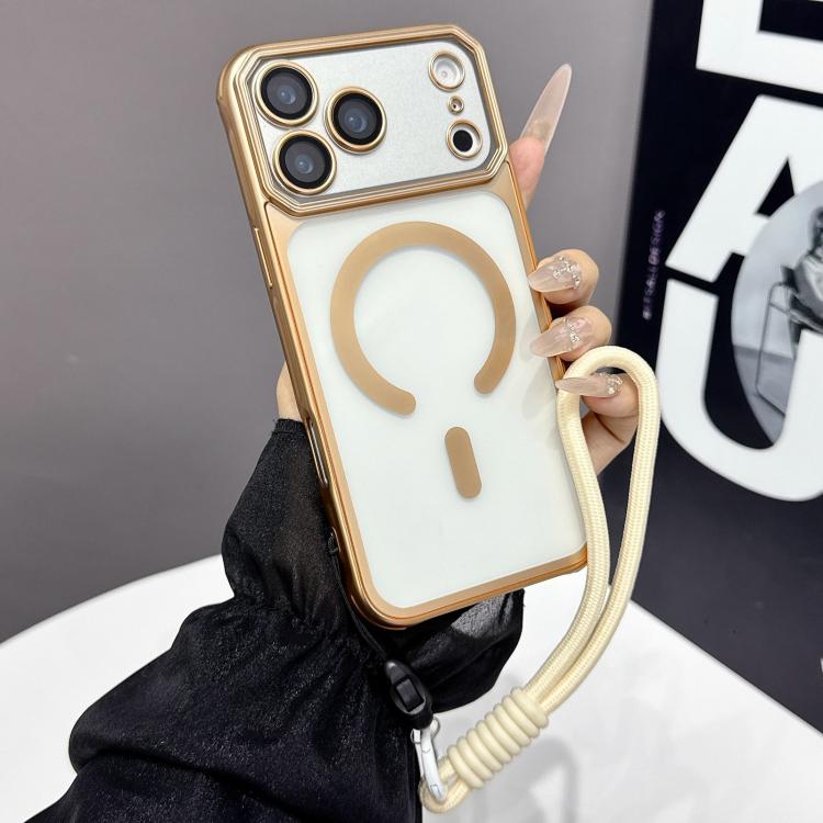 Funda MagSafe de TPU electrochapado mate con ventana grande para iPhone 17 Pro Max y correa de mano (dorada)
