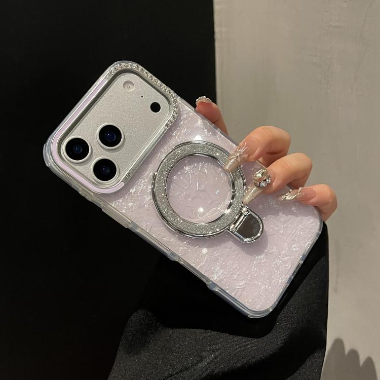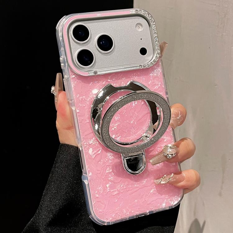 Funda para iPhone 17 Pro con carcasa dorada y colorida, diseño estampado en TPU+IMD, con soporte magnético brillante (rosa).