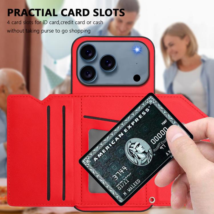 Funda para iPhone 17 Pro con cuatro ranuras para tarjetas y correa para la muñeca (roja)