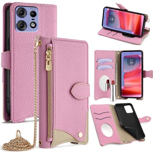 Funda de Cuero de Lichi con Diseño de Cola de Pez y Cadena Cruzada para Motorola Edge 50 Pro (Rosa)