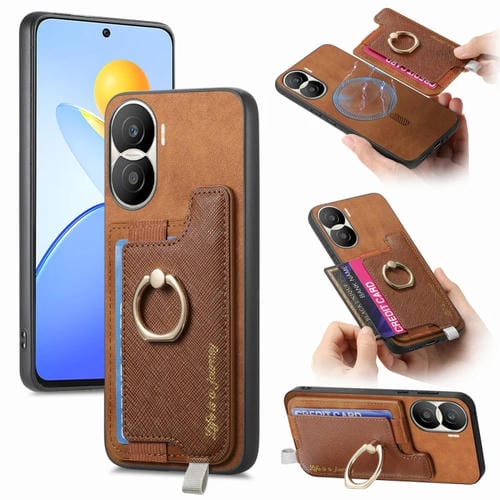 Funda para Teléfono Honor Play 7T/X7A con Tarjetero y Anillo Cuero Retro Magsafe (Marrón)