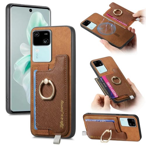 Funda para Teléfono con TaRJetero y Anillo de Cuero con Diseño Retro Magsafe para Vivo S18/S18 Pro 5G (Marrón)