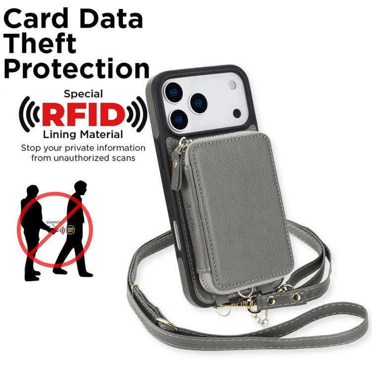 Funda tipo cartera bandolera con cremallera AwQuer 2 en 1 para iPhone 17 Pro Max con parte trasera de cuero (Gris)