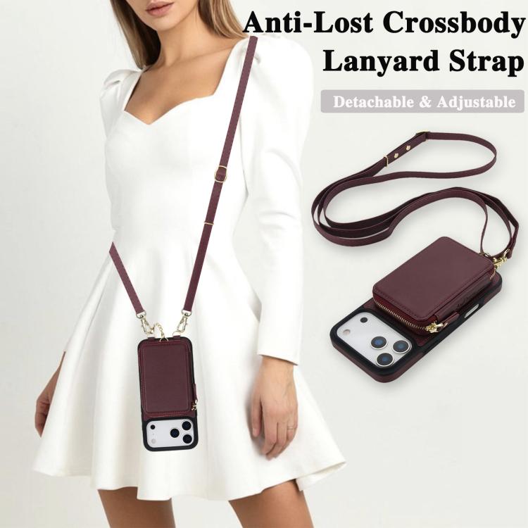 Funda tipo cartera bandolera con cremallera AwQuer 2 en 1 para iPhone 17 Pro Max, con parte trasera de cuero (rojo vino).