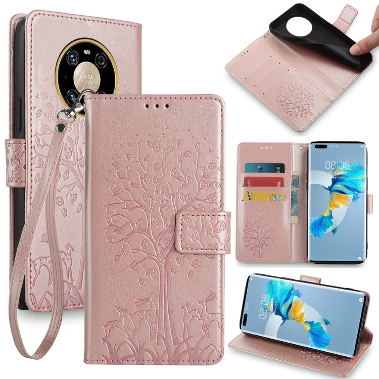 Funda de Cuero para Huawei Mate 40 Pro con Relieve de Árbol y Ciervo (Oro Rosa)