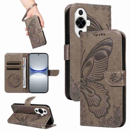Funda de Cuero para Huawei Nova 11 5G y 12S 4G con Relieve Mariposa y Cola de Golondrina (Gris)
