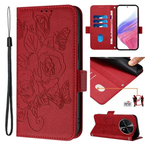 Funda de Cuero Antirrobo RFID para Huawei Nova 12I 4G con Relieve Rosa (Rojo)